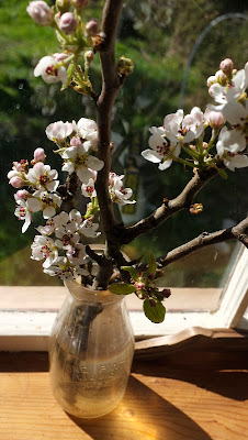 Spring is in the air! Alex did some pruning on my dad's pear and apple tress so I stole some cuttings and stuck them in a vase. Yesterday the pear buds started to bloom and it made me so happy. I love all the pretty bouquets people have in there homes this time of year. So many shades of pinks and yellows.